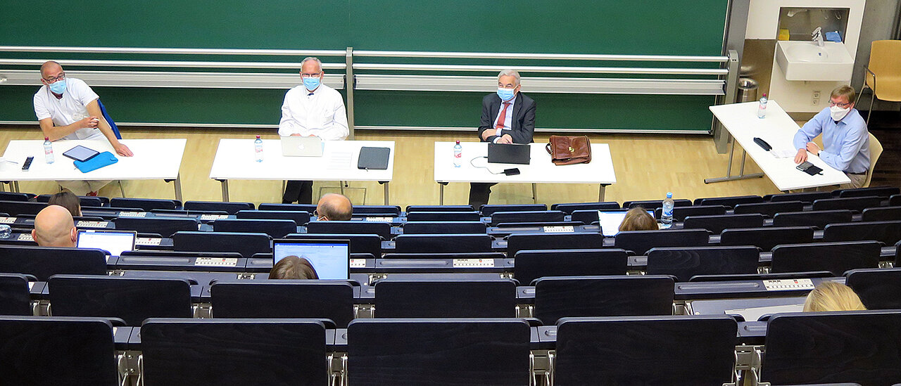 Die COVID-19-Pandemie hat wesentliche Auswirkungen auf die Arbeit des Universitätsklinikums Würzburg (UKW). Im Katastrophenfall muss die Versorgung der Patienten entsprechend politischen Bekanntmachungen, Verordnungen und Verfügungen regelmäßig angepasst werden, die Vermeidung von Infektionen bei Patienten und Personal hat höchste Priorität. Während der ersten Infektionswelle wurden Pläne für eine eskalierende Versorgung bis hin zum Stadium der Katastrophenmedizin entwickelt, die bei einem erneuten Wiederanstieg aktiviert werden können. Die Rückführung des Klinikums in Richtung Regelbetrieb stellt die Verantwortlichen jetzt vor neue Herausforderungen.