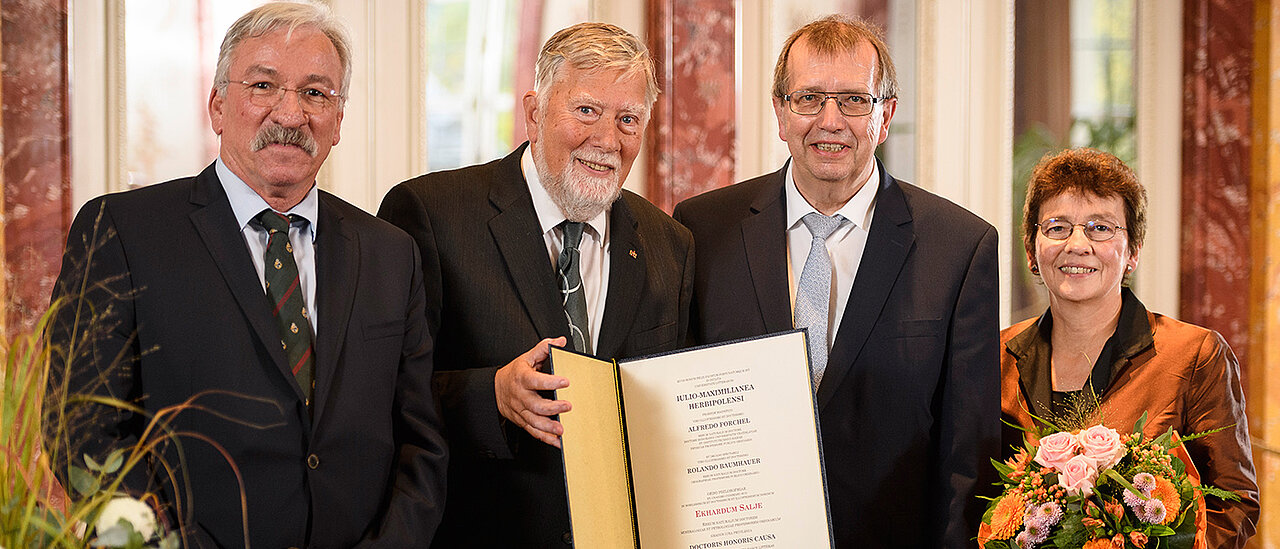 Den Praxisbezug und die praktische Anwendbarkeit seiner Forschungsergebnisse habe er immer im Auge behalten. Und genau von diesem Praxisbezug, der Expertise und der vielfältigen Erfahrung habe die Julius-Maximilians-Universität Würzburg (JMU) über viele Jahre hinweg durch seine Mitarbeit im Universitätsrat und durch seine Führungsqualitäten als langjähriger Vorsitzender dieses Rates profitiert. Mit diesen Worten begründete Professor Roland Baumhauer, Dekan der Philosophischen Fakultät, die Verleihung der Ehrendoktorwürde an Professor Ekhard Salje.