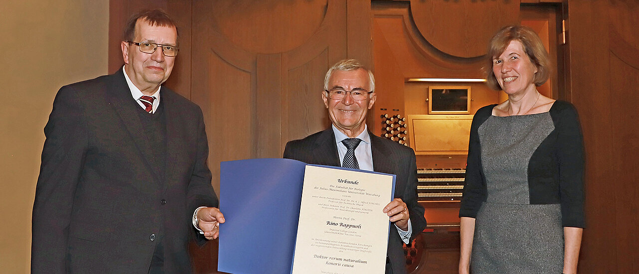 Nun hat die Fakultät für Biologie Rino Rappuolis wissenschaftliche Verdienste und seine Verbundenheit mit der JMU auch offiziell gewürdigt: Sie verlieh dem Impfstoff-Pionier die Ehrendoktorwürde. Der Festakt fand am 31. Januar 2020 in der Neubaukirche statt. Nach Grußworten von Universitätspräsident Alfred Forchel und Dekanin Charlotte Förster hielt Mikrobiologie-Professor Roy Gross die Laudatio.