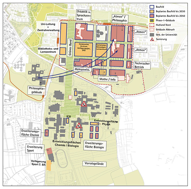 Für die Fachbereiche im Philosophiegebäude, für das Sanierungsmaßnahmen in Planung sind, sind Entfaltungsflächen und Raum für Neubauten auf dem Campus Nord vorgesehen. Danach kann das Philosophiegebäude als Ausweichfläche für verschiedene Zwecke dienen.