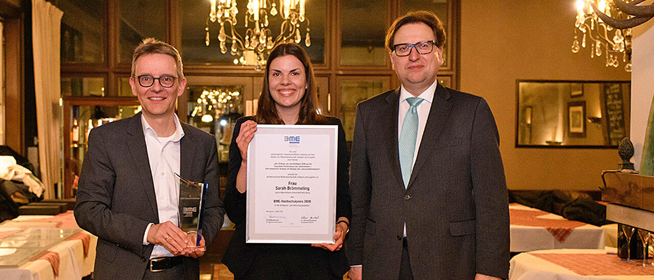 Sarah Brömmeling ist inzwischen bei der MHP Management- und IT-Beratung GmbH beschäftigt. Für ihre Masterarbeit wurde sie Anfang März mit dem Hochschulpreis 2020 des Bundesverbandes Materialwirtschaft, Einkauf und Logistik (BME) ausgezeichnet. Das Preisgeld beträgt 2.000 Euro und geht zur Hälfte an den Betreuer der Arbeit, Professor Ronald Bogaschewsky, Leiter des JMU-Lehrstuhls für BWL und Industriebetriebslehre.