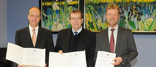 Kooperativ und strukturiert: Unter diesen beiden Schlagworten haben die Universität Würzburg, die Ostbayerische Technische Hochschule (OTH) Regensburg und die Hochschule für angewandte Wissenschaften Würzburg-Schweinfurt (FHWS) am Donnerstag, 2. Februar 2017, ein gemeinsames Promotionskolleg mit Wirkung zum 1. Januar gestartet. An der Universität Würzburg unterschrieben die Präsidenten der drei Hochschulen die entsprechende Geschäftsordnung.