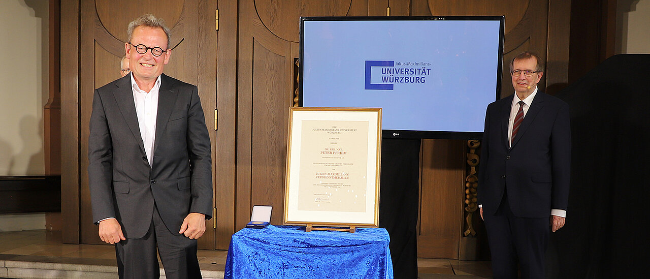 In Anerkennung seiner großartigen Verdienste um die Mittelschuldidaktik an der Universität Würzburg verlieh die JMU Dr. Peter Pfriem auf dem Stiftungsfest 2020 die Julius-Maximilians-Verdienstmedaille.