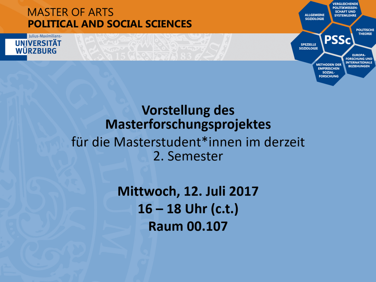 12.07.2017Am Mittwoch, den 12.07.2017, findet zwischen 16 und 18 Uhr in Raum 00.107 die Infoveranstaltung für das Masterforschungsprojekt im Wintersemester 2017/18 statt. Dies betrifft alle PSSc-Student*innen im derzeit 2. Semester.