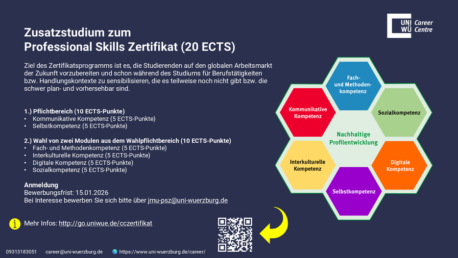 Um sich dies nun auch zertifizieren zu lassen, bietet das Career Centre ab dem Wintersemester 2025/26 offiziell das Zusatzstudium zum „Professional Skills Zertifikat“ an, das Studierende in Bachelor-, Master-, und Promotionsstudiengängen ihrem Bewerbungsportfolio beilegen können. So erhalten Arbeitgeber einen Beleg darüber, dass die Studierenden über ein hohes Maß an Selbstorganisation und Entscheidungskompetenz verfügen, um bestmöglich den Anforderungen der Arbeitswelt 4.0 zu begegnen.