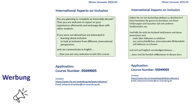 Dann sind Sie herzlich willkommen, Ihre Vorstellungen und Erfahrungen in diesen Kurs einzubringen und sich einen internationalen Blick auf Inklusion zu verschaffen.